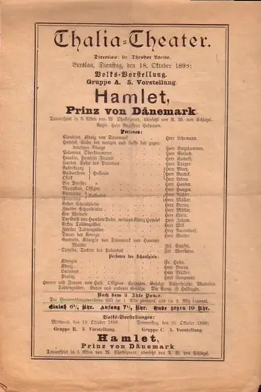 Thalia - Theater Breslau. - Theodor Loewe. - Shakespeare, William: Programmzettel zu: Hamlet. Prinz von Dänemark. Trauerspiel in 5 Akten. Übersetzt von A. W. von Schlegel. Regie: Herr Hofmann. Aufführung: Thalia - Theater am 18. Oktober 1898. Direction: T