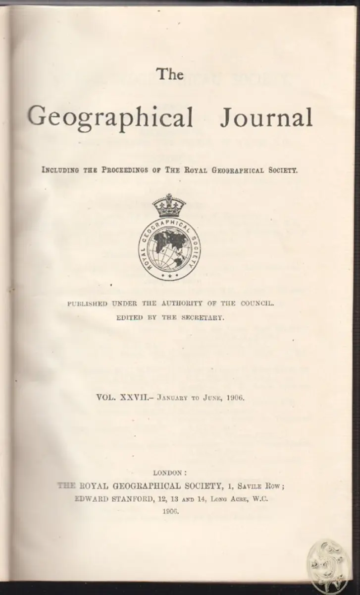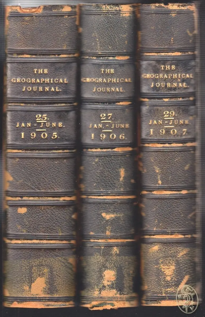 London, The Royal Geographical Society 1905/1906/1907. Vols. 25, 27, 29. Lex.-8°. VIII, 746 S. Mit 55 Taf., 52 Abb. im Text., 22 Karten, 14 mehrf. gefalt. Taf., 1 farb. Taf.; VIII, 708 S., 14 Taf., 59 Abb. im Text, 12 Karten, 20 mehrf. gefalt. Karten, 7 Pläne; VIII, 751 S. Mit 12 Taf., 78 Abb. im Text, 26 Karten, 11 mehrf. gefalt. Karten u. 10 Plänen. HLdr. d. Zt, m. Rückengoldpräg. Kanten berieb. Exlibris der `Bibliothecae Coll. B.V.M. Winton in Oxon`. Vorsatz gestemp.