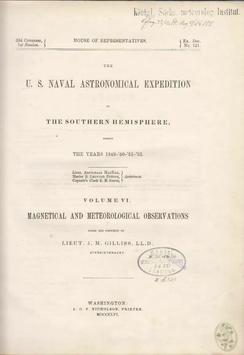Wahington, Nicholson 1856. Vol. 6. (ap.) 4°. XLVIII, 420 S. Mit zahlr. Tab. Ln. d. Zt. Mit Goldpräg. u. Blindpräg. Altes Bibl.-Expl. Einbd. leicht berieb. - (House of Representatives, 33, Congress, 1st Session, No. 121)