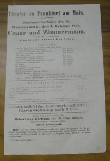Theater zu Frankfurt am Main. Intendanz: Roderich Benedix. - Albert Lortzing: Besetzungsliste zu: Czaar ( Zar ) und Zimmermann. Donnerstag, den 7. October 1858, Abonnement-Vorstellung Nro. 260 im Theater zu Frankfurt am Main. - Komische Oper in 3 Abtheilu