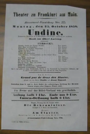 Theater zu Frankfurt am Main. Intendanz: Roderich Benedix. - Albert Lortzing: Besetzungsliste zu: Undine. Montag, den 25. October 1858, Abonnement-Vorstellung Nro. 275 im Theater zu Frankfurt am Main. - Romantische Zauberoper in 4 Abtheilungen, nach Fouqu