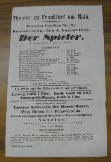 Theater zu Frankfurt am Main. Intendanz: Roderich Benedix. - August Wilhelm Iffland: Besetzungsliste zu: Der Spieler. Donnerstag, den 5. August 1858, Abonnement-Vorstellung Nro. 211 im Theater zu Frankfurt am Main. - Schauspiel in 5 Acten von Iffland. - D