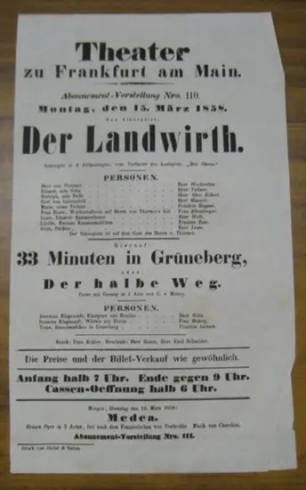 Titel: Besetzungsliste zu: Der Landwirth. Montag, den 15. März 1858, Abonnement-Vorstellung Nro. 110 im Theater zu Frankfurt am Main. - Schauspiel in 4 Abtheilungen, vom Verfasser des Lustspiels 'Der Oheim' - HIERAUF: 33 Minuaten in Grüneberg, oder: Der halbe Weg. Posse mit Gesang in 1 Acte von C. v. Holtey. - Darsteller: die Herren Werkenthin, ( Theo ) Vollmer, Alex. Kökert, Hüwart, Welb und Leser / Frau Ellenberger / Fräulein ( Friedrike ) Bognar