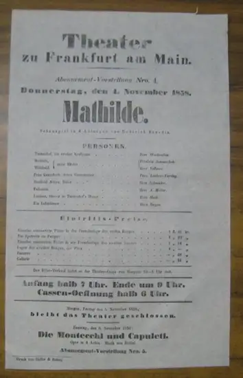 Theater zu Frankfurt am Main. Intendanz: Roderich Benedix: Besetzungsliste zu: Mathilde. Donnerstag, den 4. November 1858, Abonnement-Vorstellung Nro. 4 im Theater zu Frankfurt am Main. - Schauspiel in 4 Aufzügen von Roderich Benedix. - Darsteller: die He