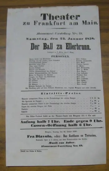 Mit Vorschau auf die Vorstellung des nächsten Tages ( 24. Januar 1858 ): Frau Diavolo nach Scribe. --- Auch vorhanden: Besetzungszettel zur Vorstellung ' Ball zu Ellerbrunn' am 12. October. --- Das Theater zu Frankfurt am Main ( Comoedienhaus ) wurde 1780 - 1782 errichtet, ab 1792 Frankfurter Nationaltheater genannt, ab 1842: Frankfurter Stadttheater. Es war das erste Stadttheater in Frankfurt am Main. Bis Ende 1902 wurde es bespielt, stand dann einige Jahre leer und wurde schließlich abgerissen.