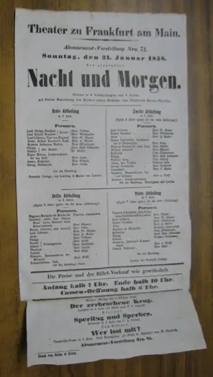 Theater zu Frankfurt am Main. Intendanz: Roderich Benedix. - Edward George Bulwer-Lytton. - Charlotte Birch-Pfeiffer: Besetzungsliste zu: Nacht und Morgen. Sonntag, den 31. Januar 1858, Abonnement-Vorstellung Nro. 74. Drama in 4 Abtheilungen und 5 Acten m