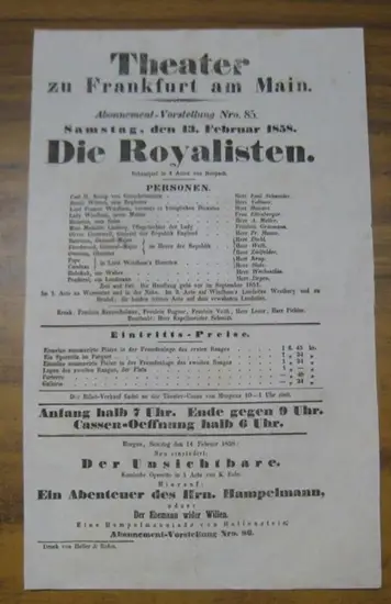 Theater zu Frankfurt am Main. Intendanz: Roderich Benedix. - Ernst Raupach: Besetzungsliste zu: Die Royalisten. Samstag, den 13. Februar 1858, Abonnement-Vorstellung Nro. 85 im Theater zu Frankfurt am Main. - Schauspiel in 4 Acten von Raupach. - Mitwirken