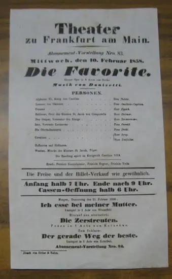 Theater zu Frankfurt am Main. Intendanz: Roderich Benedix. - Eugene Scribe. - Gaetano Donizetti: Besetzungsliste zu: Die Favorite. Mittwoch, den 10. Februar 1858, Abonnement-Vorstellung Nro. 83 im Theater zu Frankfurt am Main. - Grosse Oper in 4 Acten von