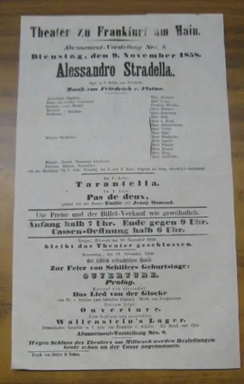 Mit der Vorschau auf die Vorstellung des übernächsten Tages ( 14. August ): Ein Glas Wasser, nach Cosmar. --- Auch vorhanden: Besetzungszettel zur Vorstellung des 'Alessandro Stradella' am 9. November. --- Das Theater zu Frankfurt am Main ( Comoedienhaus ) wurde 1780 - 1782 errichtet, ab 1792 Frankfurter Nationaltheater genannt, ab 1842: Frankfurter Stadttheater. Es war das erste Stadttheater in Frankfurt am Main. Bis Ende 1902 wurde es bespielt, stand dann einige Jahre leer und wurde schließlich abgerissen.