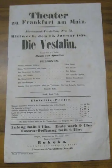 Theater zu Frankfurt am Main. - Intendanz: Roderich Benedix. - Gaspare Luigi Pacifico Spontini (1774 - 1851 ): Besetzungsliste zu: Die Vestalin. Mittwoch, den 13. Januar 1858, Abonnement-Vorstellung Nro. 58, Theater zu Frankfurt am Main. - Grosse Oper in