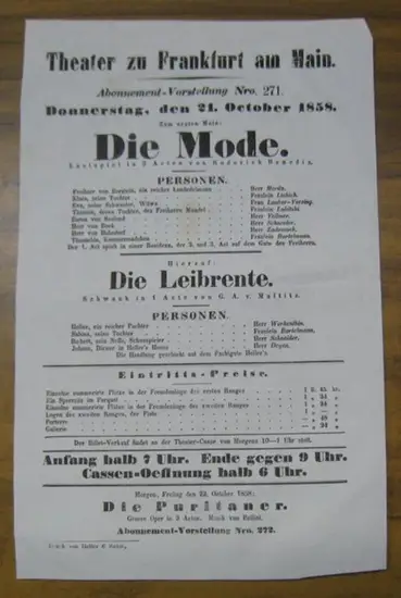 Titel: Besetzungsliste zu: Die Mode. Donnerstag, den 21. October 1858, Abonnement-Vorstellung Nro. 271 im Theater zu Frankfurt am Main. - Lustspiel in 3 Acten von Roderich Benedix. - Darsteller: die Herren Moritz, ( Theo ) Vollmer, Schneider und ( Paul ) Zademack / Fräulein Liebich, ( Toni ) Labitzki, ( Maria ) Bartelmann / Frau ( Auguste ) Lauber-Versing. - Weiteres Stück dieses Abends: Die Leibrente. Schwank in 1 Acte von G. A. v. Maltitz.