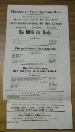 Titel: Besetzungsliste zu: Die Milch der Eselin. Letzte Gastdarstellung der 3 Zwerge, Herren Jean Piccolo, Jean Petit und Kiss Jozsi. Montag, den 11. October 1858, mit aufgehobenem Abonnement, im Theater zu Frankfurt am Main. - Posse mit Gesang in 1 Acte, nach dem Französischen von Bittner. - Weitere Stücke dieses Abends: Ein gebildeter Hausknecht. Posse, frei bearbeitet nach Korntheuer' s Lustspiel 'Alle sind verheirathet' / Die Recrutirung der Zwerge in Krähwinkel. Posse von Flamm. - Weitere Darsteller: Fräulein ( Toni ) Labitzki, ( Maria ) Bartelmann, Zeis / die Herren Diehl, Lehmann, Graner, Degen, Welb, Stotz, A. Müller
