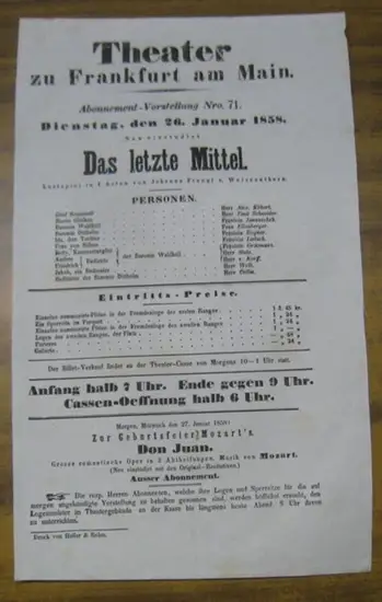 Mit Vorschau auf die Vorstellung des nächsten Tages ( 27. Januar 1858 ): Don Juan von Mozart. --- Auch vorhanden. Programmzettel zur Vorstellung 'Das letzte Mittel' am 29. Juli. --- Das Theater zu Frankfurt am Main ( Comoedienhaus ) wurde 1780 - 1782 errichtet, ab 1792 Frankfurter Nationaltheater genannt, ab 1842: Frankfurter Stadttheater. Es war das erste Stadttheater in Frankfurt am Main. Bis Ende 1902 wurde es bespielt, stand dann einige Jahre leer und wurde schließlich abgerissen.