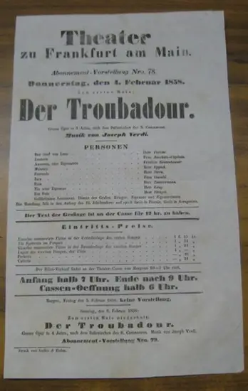 Theater zu Frankfurt am Main. Intendanz: Roderich Benedix. - Salvadore Cammarano / Giuseppe Verdi: Besetzungsliste zu: Der Troubadour. Donnerstag, den 4. Februar 1858, Abonnement-Vorstellung Nro. 78 im Theater zu Frankfurt am Main. - Grosse Oper in 4 Acte
