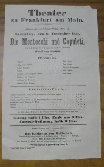 Titel: Besetzungsliste zu: Die Montecchi und Capuleti. Samstag, den 6. November 1858, Abonnement-Vorstellung Nro. 5 im Theater zu Frankfurt am Main. - Oper in 4 Acten, nach dem Italienischen von Fr. Ellmenreich. - Darsteller: die Herren Abiger, ( Franz ) Eppich und Leser / Frau Oswald / Fräulein Kessenheimer