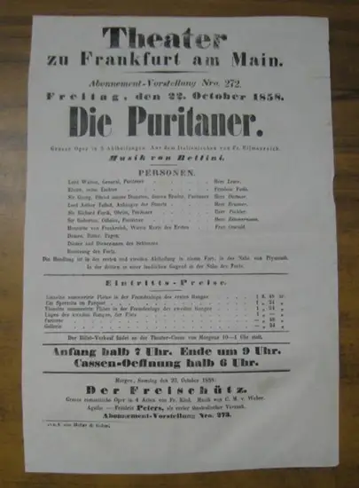 Titel: Besetzungsliste zu: Die Puritaner. Freitag, den 22. October 1858, Abonnement-Vorstellung Nro. 272 im Theater zu Frankfurt am Main. - Grosse Oper in 3 Abtheilungen. Aus dem Italienischen von Fr. Ellmenreich. - Darsteller: die Herren Leser, ( Wilhelm Georg ) Dettmer, Brunner, ( Carl ) Pichler und Zimmermann / Fräulein Veith / Frau Oswald