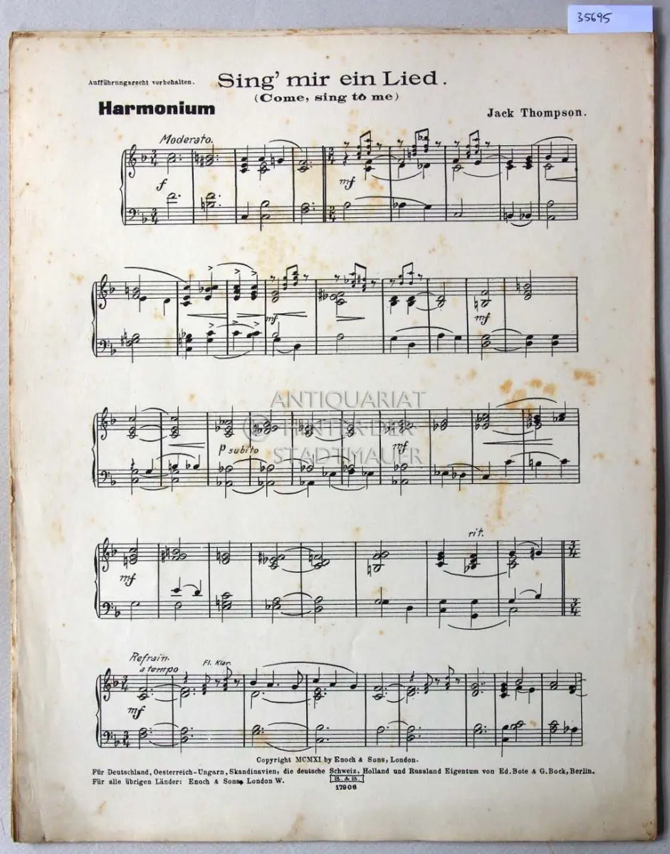 Deckblatt und lose Stimmblätter. Seiten etwas fleckig, etwas randlädiert, ein Blatt mit handschriftlichen Notenlinien auf der (urspr. leeren) Rückseite, sonst ohne Eintragungen; gutes Set.(vorhandene Stimmen: Harmonium, Violine obligat, Violoncell, Flöte, Klarinette in B, Trompete in B, Posaune, Pauken un F u. C-Gr. u. kl. Trommel-Triangel)