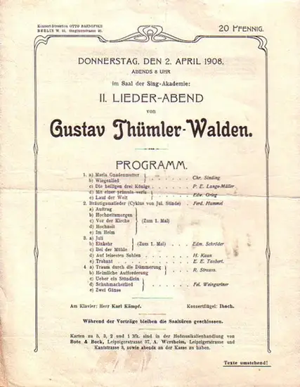 Thümler - Walden, Gustav: Programmzettel zum 2. Lieder - Abend von Gustav Thümler - Walden im Saal der Singakademie, Berlin am 2. April 1908. Mit den Gesangstexten. Konzert - Direktion Otto Barnofske, Berlin, Stegitzerstrasse 93.