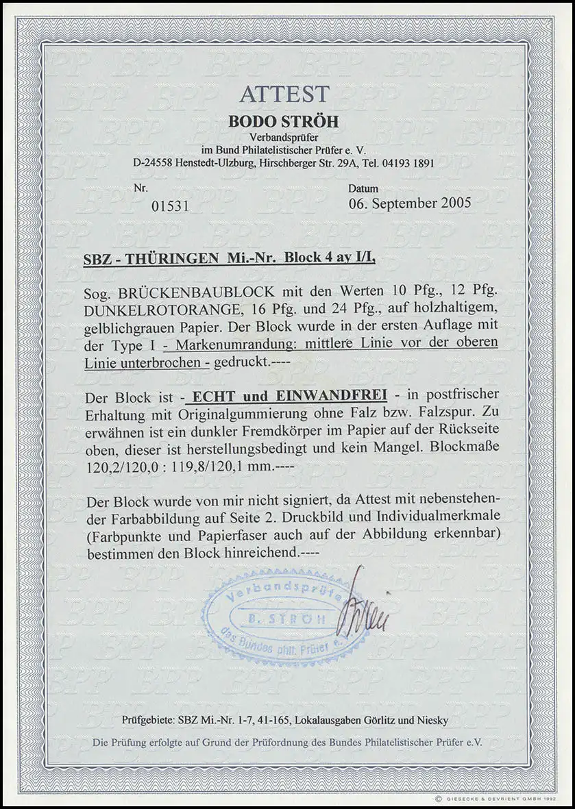 Block der ersten Auflage Type I, Farbe a, Papier y, Fotoattest Ströh BPP "echt und einwandfrei".