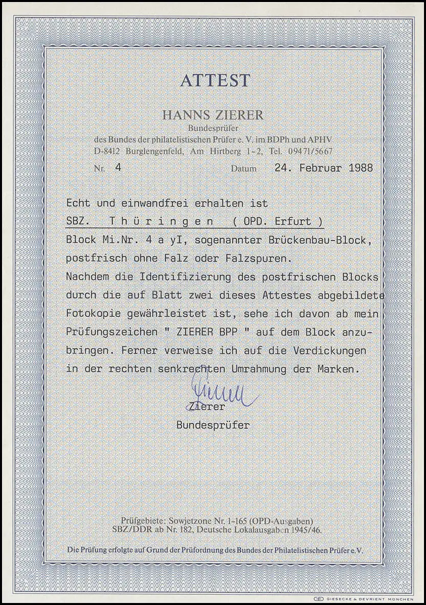 Thüringen Block 4 ay I/I Brückenbau, postfrisch ** FA Zierer einwandfrei