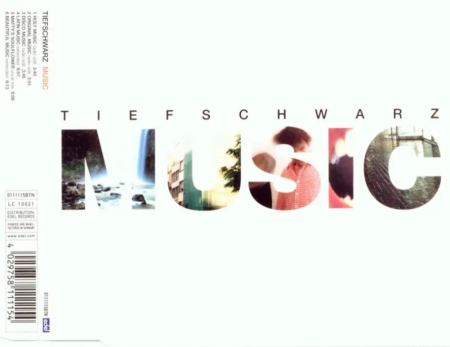 CD Single Tiefschwarz - Music, Zustand CD M- Hülle M-; Made in Germany 1999 Benztown 0111115BTN, Tracks Holy Music - Radio Edit 3:40, Original Music - Radio Edit 3:51, Disco Music - Radio Edit 3:45, Latin Music - Ext. 8:57, Matty's Soulflower - Vocal Mix 8:57, Beautiful Music 8:13
