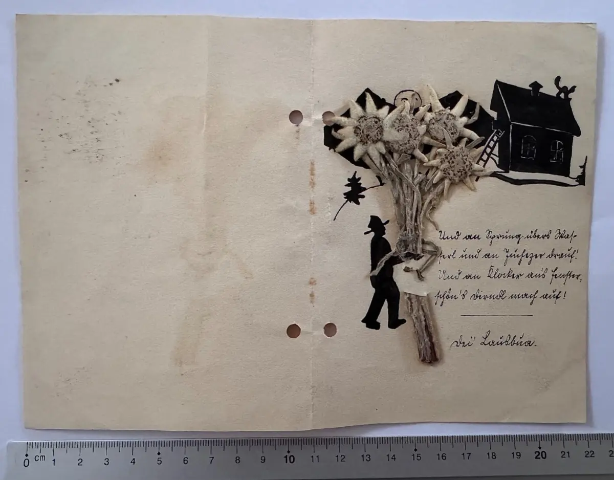 Innsbruck – Tirol – Alpenländischer Liebesgruß um 1910. Wunderschöne handgefertigte Karte mit echten Edelweißblüten, feiner Tuschezeichnung eines Hauses mit Bergsteigerfigur und liebevollem Gedicht in deutscher Kurrentschrift.