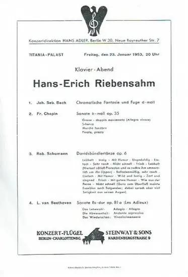 Titania-Palast Steglitz, Berlin. - Riebensahm, Hans-Erich: Programmzettel zum Klavier-Abend von Hans-Erich Riebensahm am 23. Januar 1953 im Titania-Palast Steglitz. Programm: Bach, Chopin, Schumann und Beethoven. Konzertdirektion Hans Adler, Berlin.