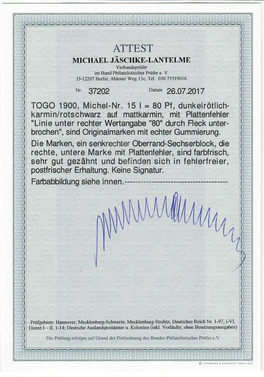 Togo: MiNr. 15I, Plattenfehler, 6er Block vom Oberrand, BPP Attest