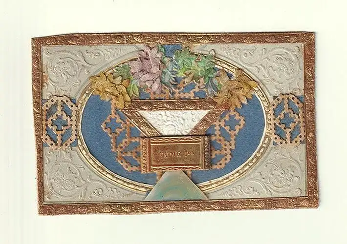 o. O. [um 1820]. 6, 2 x 8, 6 cm (Gesamtgr.). Kunstbillet mit plastischen Blumen aus Leinen, farb. plastischen Papierblumen, Stanzpapier u. stilisierter Amphore aus reliefgeprägten Papierelementen und Permuttdreieck in mit blauem Buntpapier hinterlegten Medaillon, in reliefgeprägter Karter mit goldenen Papierleisten. Leinenblumen etwas lädiert, Stanzpapier etwas gebräunt.
