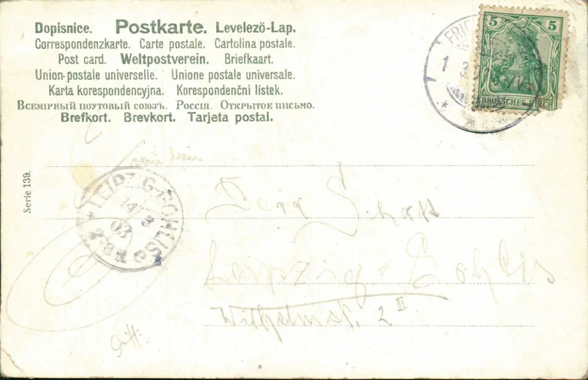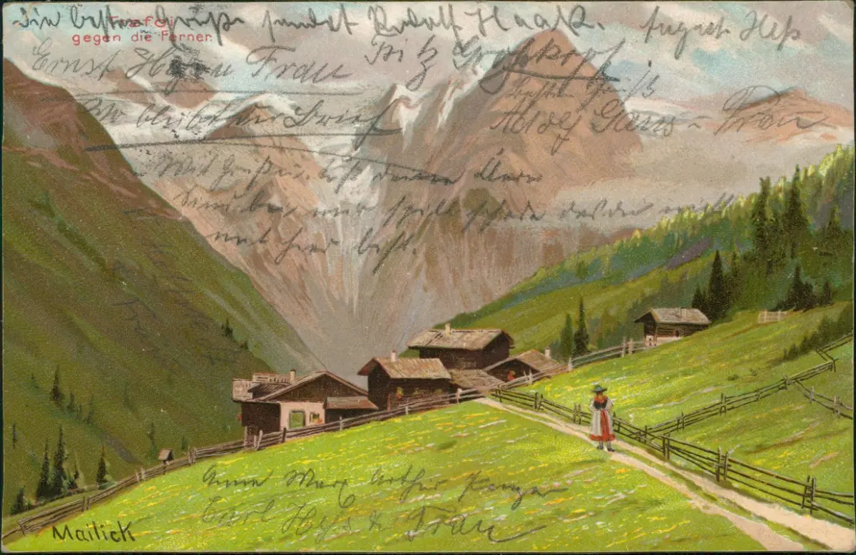 Infos: Ansicht einer malerischen Alpenlandschaft mit mehreren traditionellen Almhütten auf grünen Hängen. Ein Pfad schlängelt sich durch die Szenerie, auf dem eine Person in traditioneller Kleidung wandert. Im Hintergrund erheben sich hohe, felsige Berge. Die Karte ist eine 'Künstlerkarte' der 'Mailick Serie 139' und wurde als 'Weltpostverein' Postkarte herausgegeben, mit mehrsprachigen Bezeichnungen für 'Postkarte'.