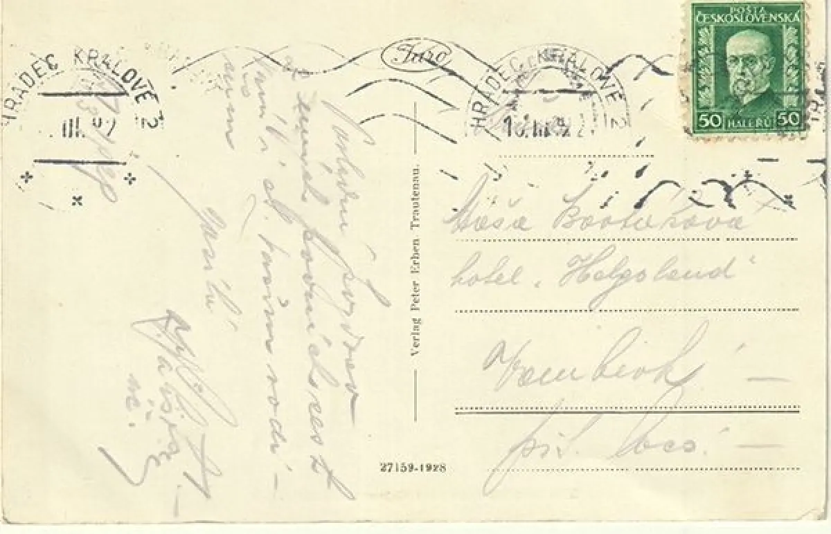 Bemerkungen: Gelaufen nach Vamberk von Hradec Kralove 1928.