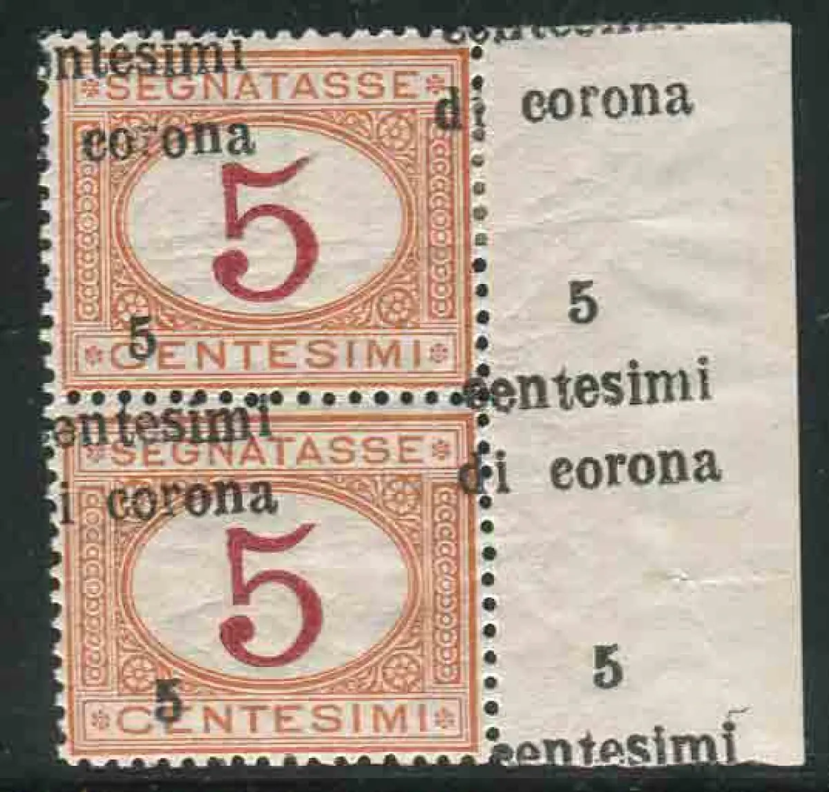 Trient und Triest - Cent Steuermarken. 5 stark verschobene Überdrucksorten **/* MNH/MH - Trient und Triest - Cent Steuermarken. 5 n. 1nc vertikales Drehmoment b. von f. mit stark in beide Richtungen versetztem Aufdruck - Ungewöhnlich - Kat. 450 n. 1049/5