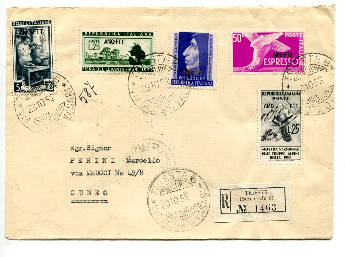 Umschlag - Triest A - Bari ' 52 Nr. 153 + Ergänzungen Nr. 92 + 154 + 156 + Espresso Nr. 7 auf Umschlag Racc. für Cuneo am 28.10.52 - Zwillingswerte im Tarif Cod.1500/WEB