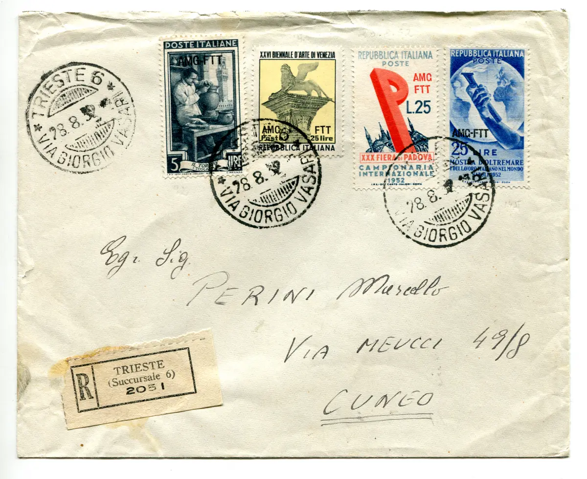 Umschlag - Triest A - Biennale von Venedig Nr. 150 + Ergänzungen Nr. 92 + 149 + 151 auf Umschlag Racc. für Cuneo am 28.8.52 - wertvolle Verwendung von Zwillingswerten, im Tarif Cod.1494/WEB