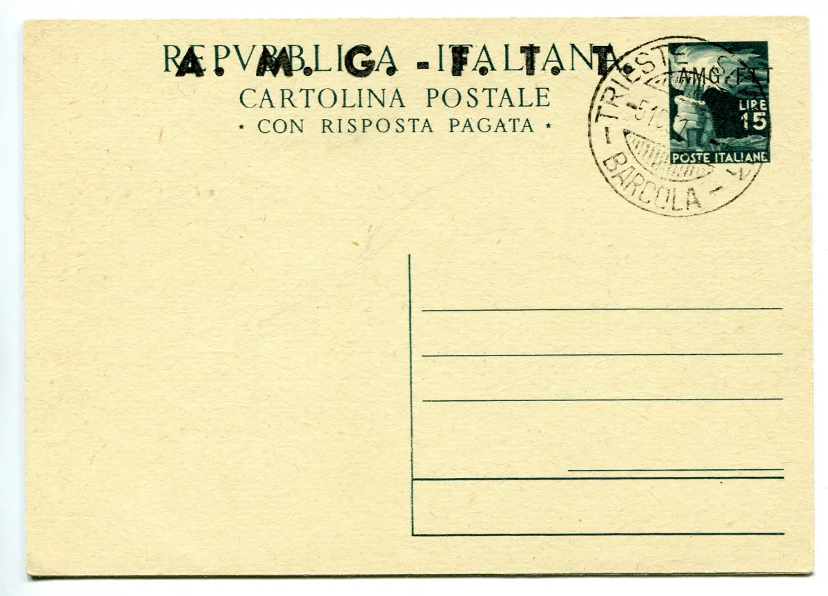 Triest A - C.P. Lire 15+15 Democratica n. C 11 großer Aufdruck - gebrauchte Postkarte - Triest A - C.P. Lire 15+15 Democratica n. C 11 großer Aufdruck - gebraucht, nicht gereist - Kat. 65 Code Nr. 833/4
