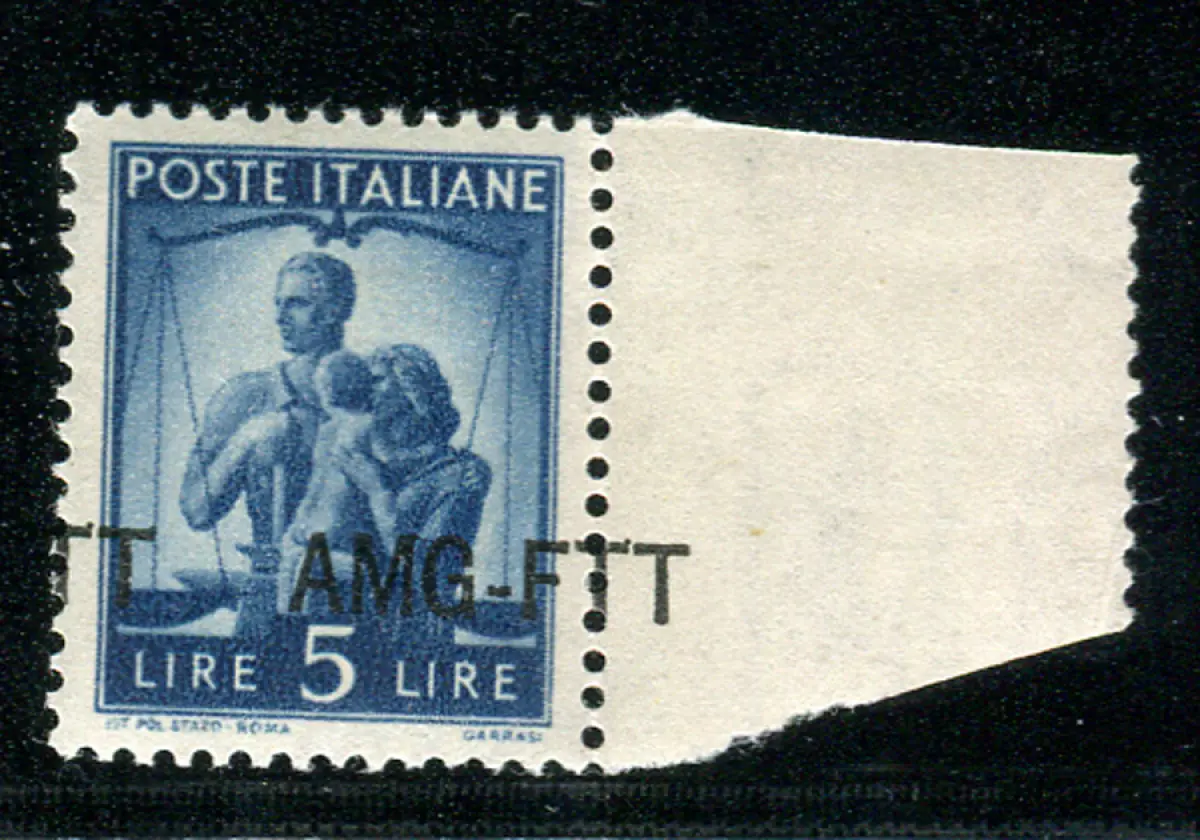 Triest A - Democratica Lire 5 Sorten verschobener Aufdruck Vollgummi - Democratica Lire 5 Nr. 59ga schönes Exemplar b. von f. mit stark nach unten und links verschobenem Aufdruck - Teil des Aufdrucks am Blattrand Cod. 1025/13