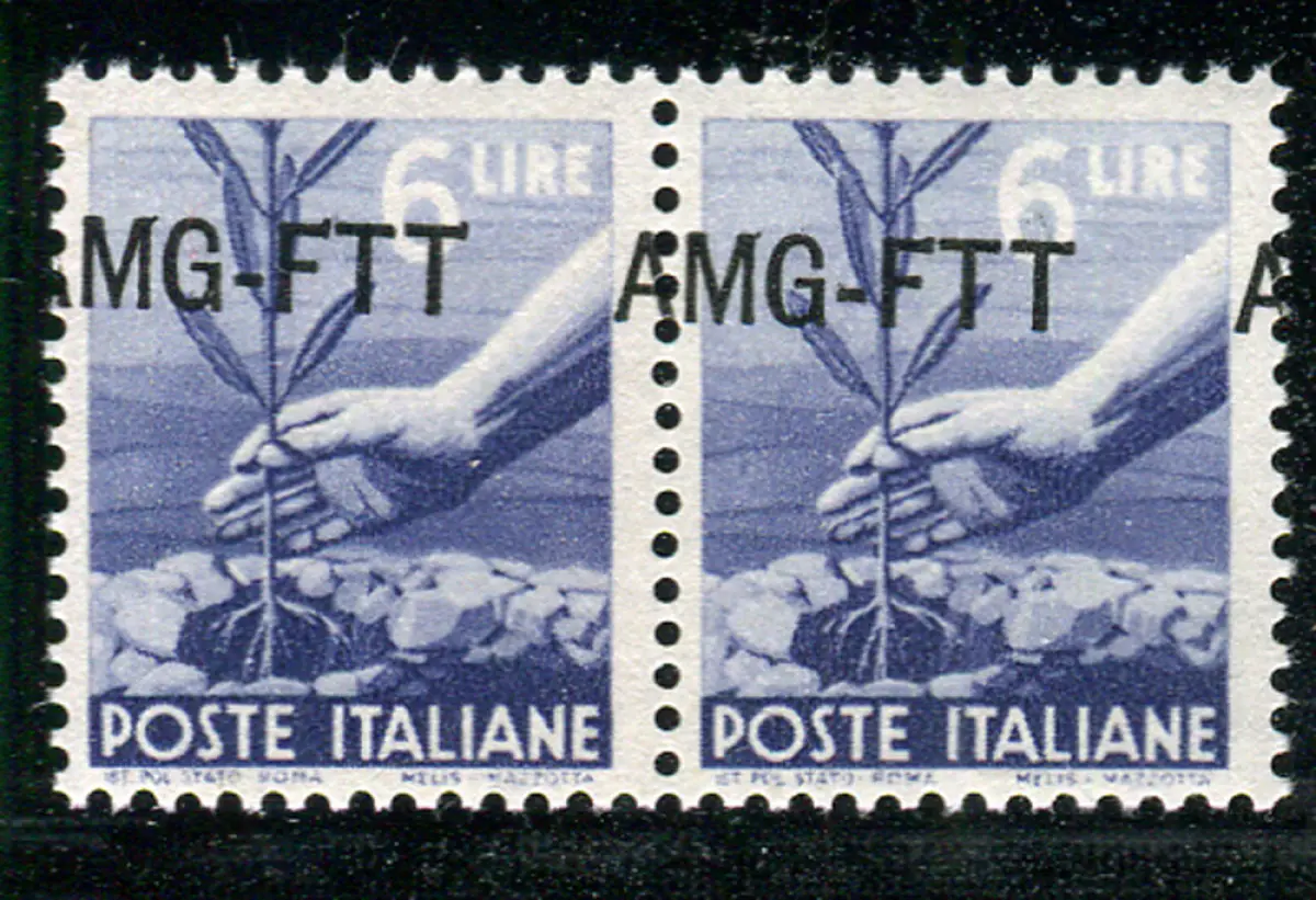 Triest A - Democratica Lire 6 Sorten verschobener Aufdruck Vollgummi - Democratica Lire 6 Nr. 60f Paar mit stark nach oben und links verschobenem Aufdruck - Cod. 1026/13