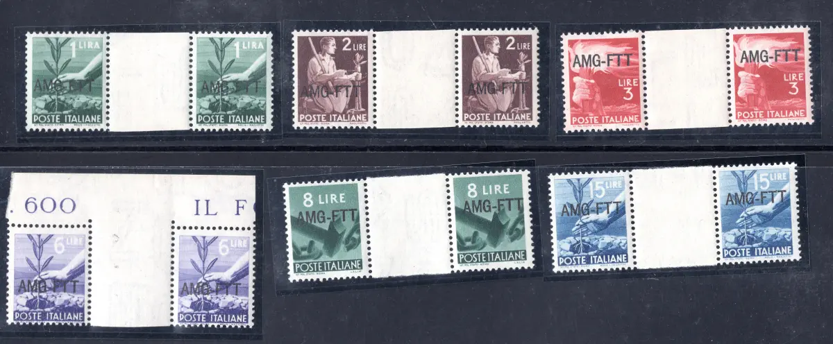 MHN Vollgummi - Demokratisch - 10 verschiedene Werte der Serie in Paaren getrennt in der Mitte durch Gruppenzwischenraum (Nr.56/58 + 60/66) - Der Lire 50 mit verschiedenen Aufdrucken, großer Druckstrich - Schönes Set zur Spezialisierung dieser Serie - Selten - Katalog nur 400 Euro-Briefmarken Cod. 613/7