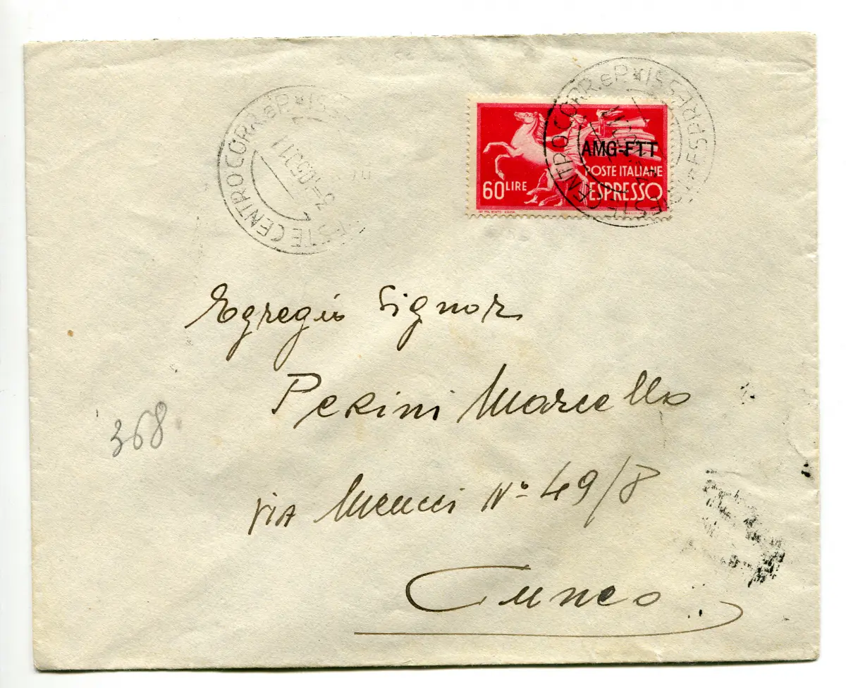Triest A - Espresso Lire 60 isoliert im Tarif Umschlag - Triest A - Espresso Lire 60 Nr. 6 isoliert auf Espressobeutel für Cuneo am 3.10.50 - Seltener einmaliger Gebrauch Euro80 Cod.1516/WEB