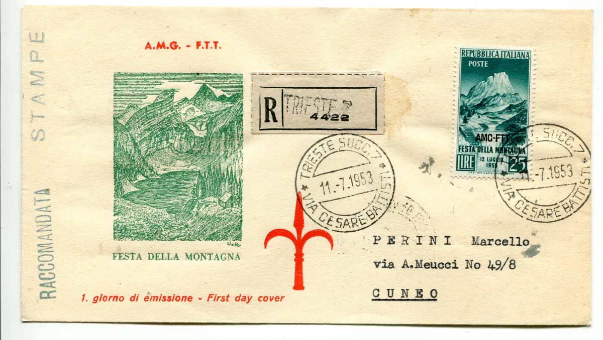 Umschlag - Triest A - Festa della Montagna Nr. 181 auf figürlichem FDC-Umschlag Rote Lilie gereist, eingeschrieben mit Zusatzfrankatur für 15 Lire auf der Rückseite (Nr. 96) - Schön und ungewöhnlich Cod.1453/WEB