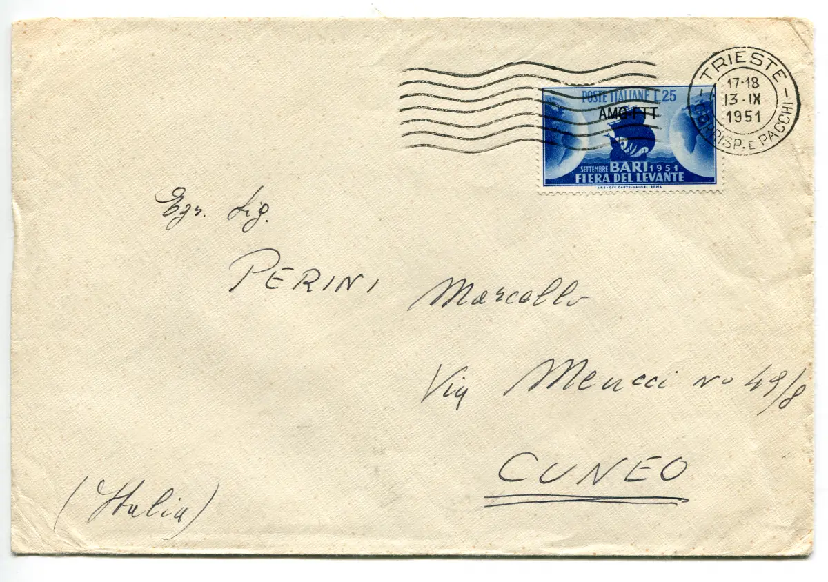 Triest A - Fiera del Levante 1951 isoliert auf Umschlag - Triest A - Fiera del Levante 1951 Nr. 128 isoliert auf Umschlag nach Cuneo gereist - Seltene einmalige Verwendung im Tarif Cod.1471/WEB
