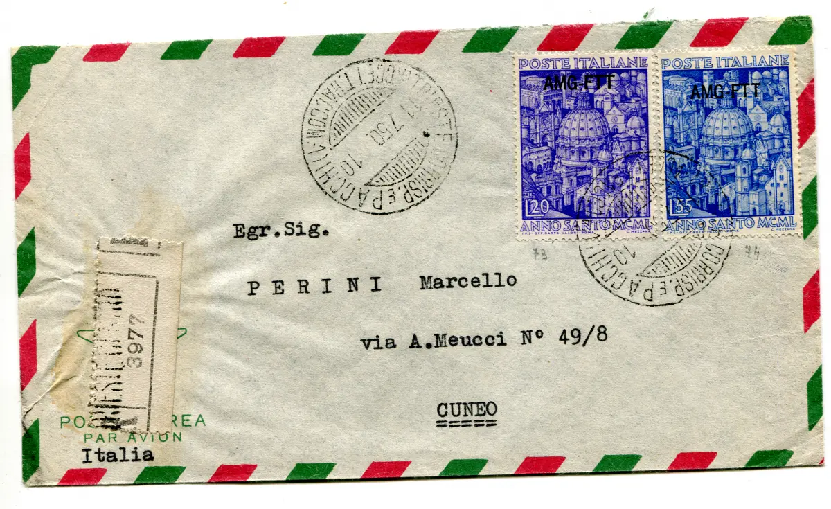 Triest A - Heiliges Jahr auf Umschlag Racc. espresso Umschlag - Trieste A - Anno Santo Nr. 73/74 Serie auf Umschlag Racc. für Cuneo am 11.7.50 - Schön und ungewöhnlich Cod.1488/WEB