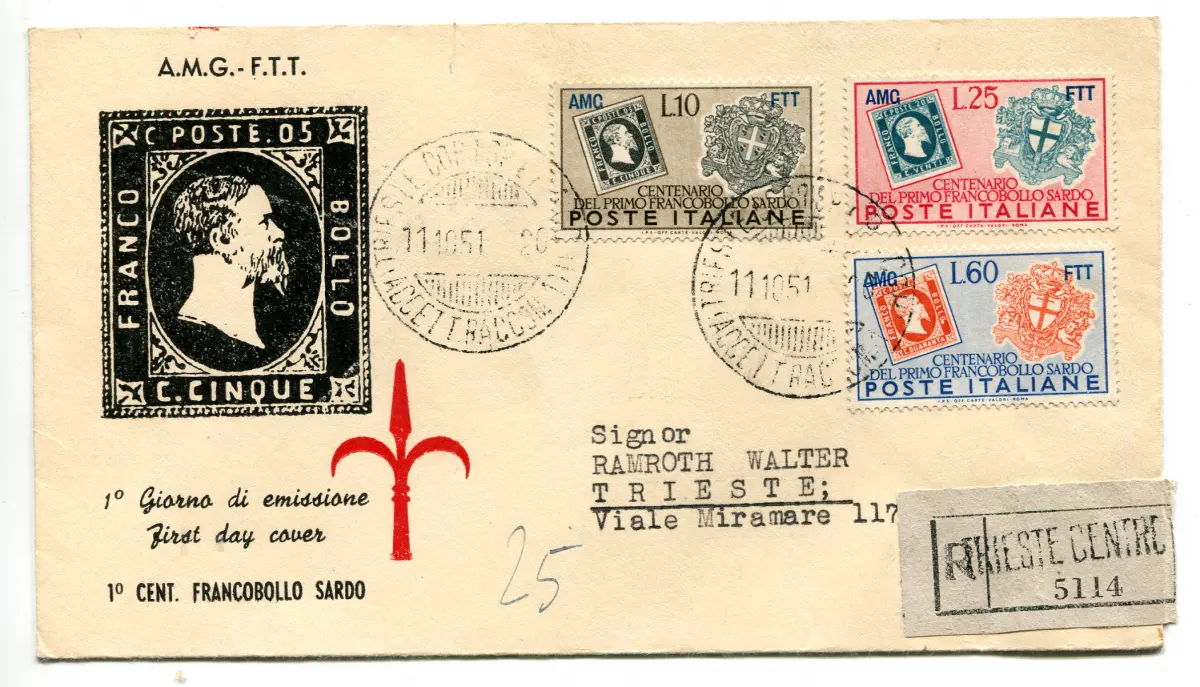 Triest A - Hundertjahrfeier von Sardinien auf Umschlag FDC Umschlag - Triest A - Hundertjahrfeier von Sardinien Nr. 130/132 Serie auf figürlichem Umschlag FDC gereist - schön und ungewöhnlich Cod.1433/WEB