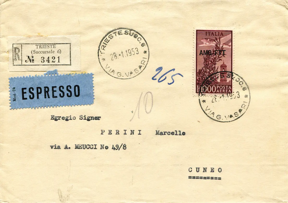 Triest A Lire 1.000 Kapitol isoliert auf Umschlag Umschlag - Luftpost Lire 1.000 Kapitol rotbraun Nr. 26A isoliert auf Umschlag Racc. exp. von Triest nach Cuneo am 28.1.53 - Seltener Postgebrauch - Kat. 1.300 Cod. 1032/14