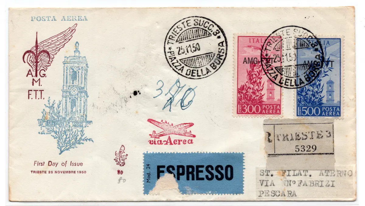 Umschlag - Triest A - Luftpost Lire 300 und 500 Kapitol Auflage von Rom auf Umschlag Racc. Express mit schriftlicher Stornierung mit Stiftschrift und gerissenem ESPRESSO Etikett - Selten - Gebraucht Cod. 558/17