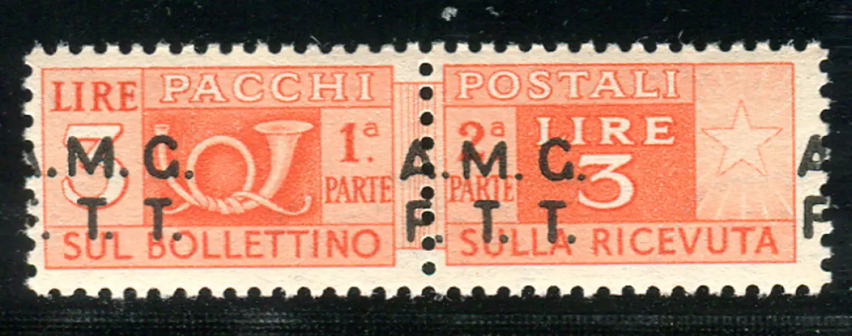Triest A - Postpakete Lire 3 Sorten Aufdruck nach links verschoben Vollgummi - Postpakete Lire 3 Nr. 3h stark nach links verschobener Aufdruck M.G. A. - Ungewöhnlich bei so stark relevanter Verschiebung Cod. 1034/13