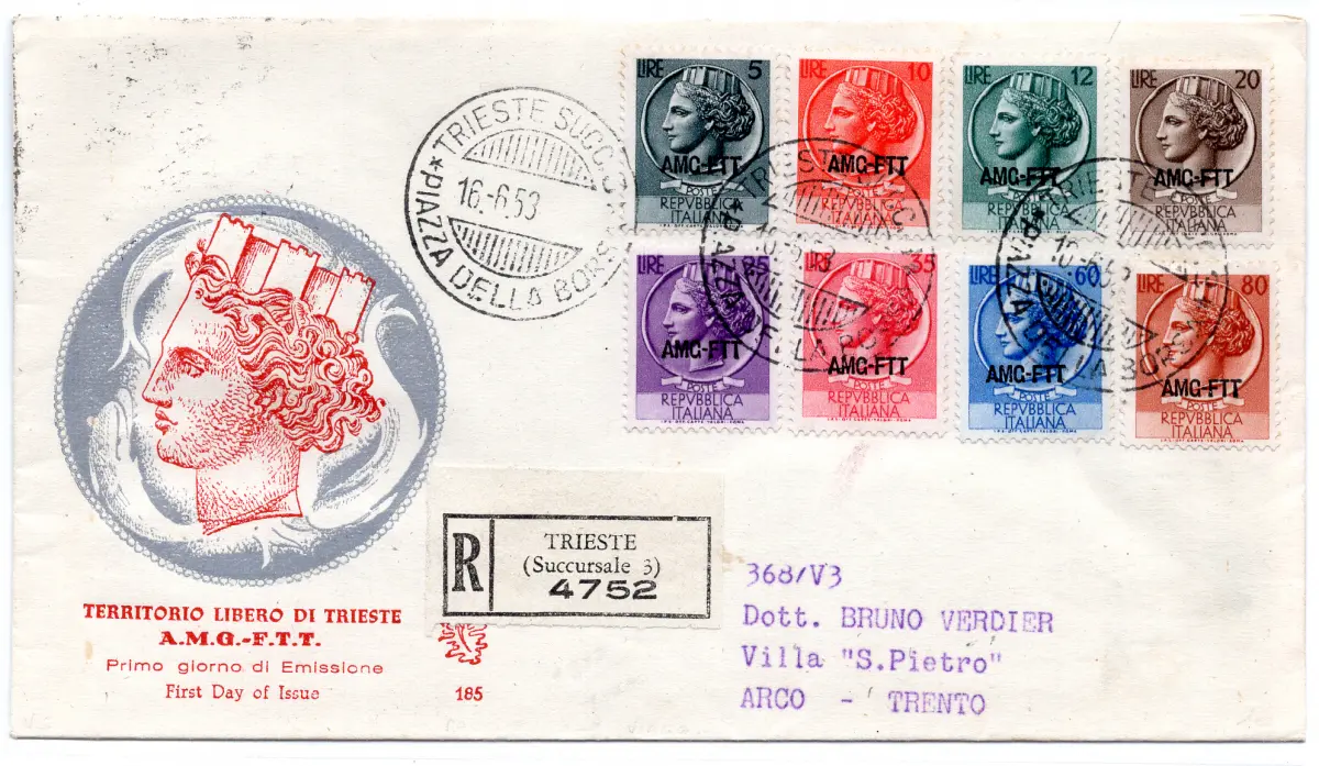 Umschlag - Syrakus Nr. 168/176 Serie acht Werte ausgegeben am 16.6.53 auf Umschlag Racc. mit Ankunftsstornierung - Selten Cod. 590/17