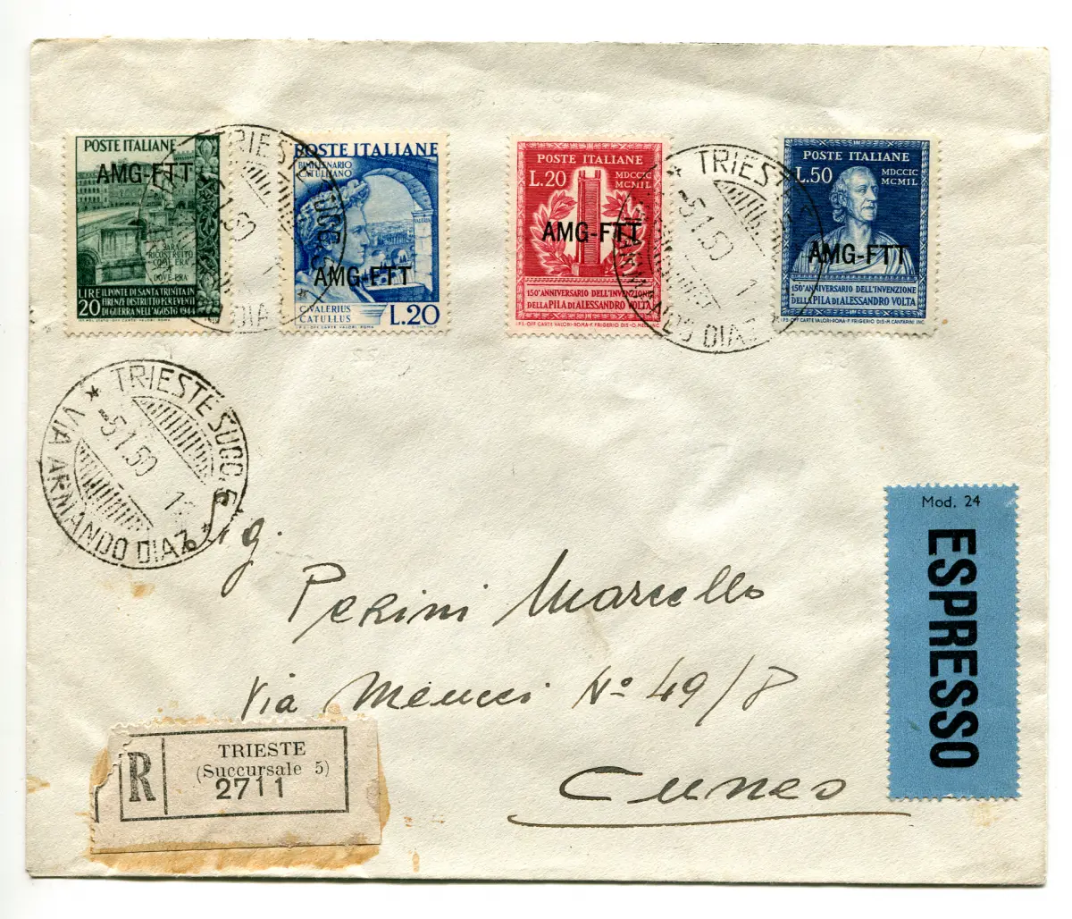 Umschlag - Triest A - Volta Nr. 52/53 Serie + Ergänzungen Nr. 54 + 55 auf Umschlag Racc. Express für Cuneo am 5.1.50 - Schön und ungewöhnlich Cod.1475/WEB