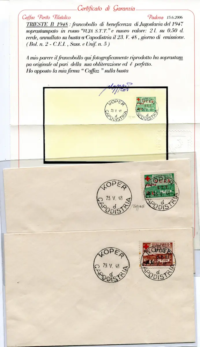 - Triest B - Pro Rotes Kreuz Nr. 4/5 zwei Werte auf zwei stornierten Umschlägen Koper Capodistria 23.5.48 Ausgabetag - Ungewöhnlich - Zert. Caffaz - Kat. 1.000 n. 889/L