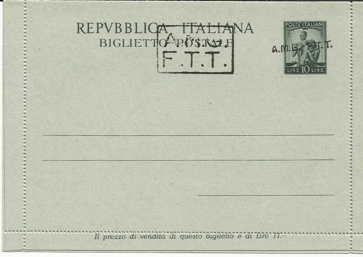 Triest A - B.P. Lire 10 Democratica Nr. B 1 (sz. A+B) neue Postkarte - Triest A - B.P. Lire 10 Democratica Nr. B 1 (sz. A+B) Neu einwandfrei - Ungewöhnlich - Kat. euro 120 Code Nr. 862/4